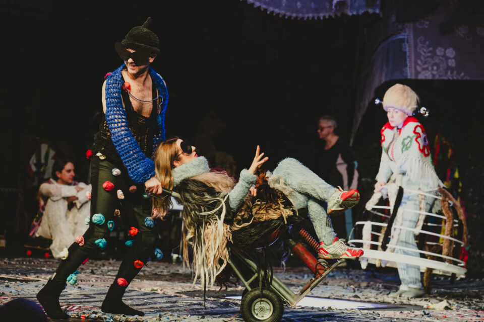 Kształt spektaklu odpowiada tej idei z imponującą konsekwencją. To przedstawienie rozwija się jak patchwork – nie tylko na poziomie scenografii, zaprojektowanej w duchu recyklingu i rękodzieła, ale także dramaturgii. To nie jest przedstawienie linearne. Weronika Szczawińska (reżyseria) i Piotra Wawer jr. (dramaturgia) tworzą konstrukcję zszywaną z konwencji, estetyk i rytmów. Wspólnota nie oznacza tu ujednolicenia, lecz współobecność różnic. Na scenie pojawiają się postaci, których kostium nie jest dodatkiem, tylko strukturą, która narzuca sposób poruszania się, gestykulacji, a nawet mówienia. W efekcie powstają osobliwości, które trudno oddzielić od materii, z której zostały stworzone. Ważną rolę odgrywa także wykonywana na żywo muzyka, która przywołuje na myśl piosenki wykonywane przez koła gospodyń wiejskich, stająca się narzędziem budowania relacji między aktorami, ale też między sceną a widownią. To teatr, który nie ukrywa swojego zaplecza. Nie udaje iluzji. Przeciwnie – pokazuje, że rzeczywistość sceniczna jest konstruktem i to, jak powstaje, jest równie istotne jak to, co przedstawia.Mimo tej formalnej złożoności spektakl nie rezygnuje z narracji. Historia Marion (Anna Błaut) pozostaje główną osią, choć jej przebieg nie przypomina klasycznej opowieści. Pojawiają się wątki groteskowe i kryminalne, elementy quasi-religijne, a nawet komiczne. W pewnym momencie świat przedstawiony zaczyna się przekształcać w wizję postapokaliptyczną.