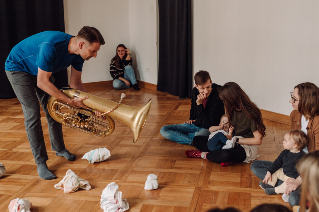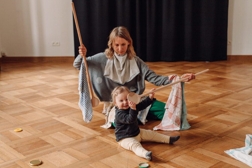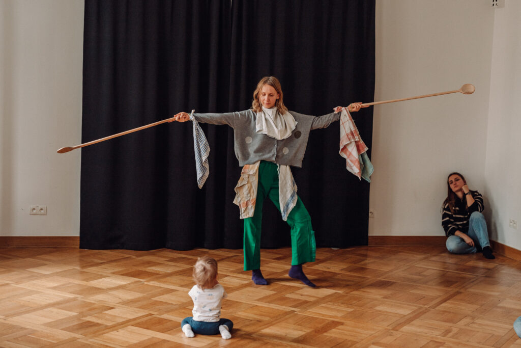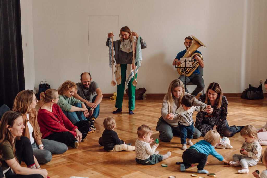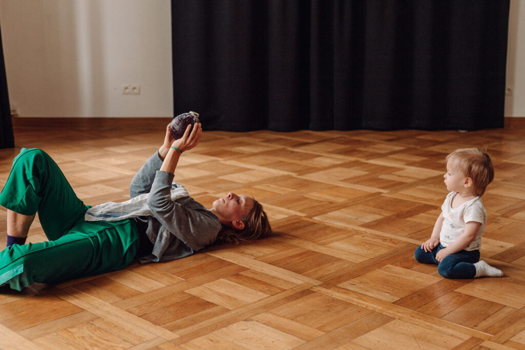 „Okruszku” to taneczny spektakl interaktywny dla rodzin z dziećmi od 6 do 15 miesiąca życia (dzieci jeszcze niechodzące).