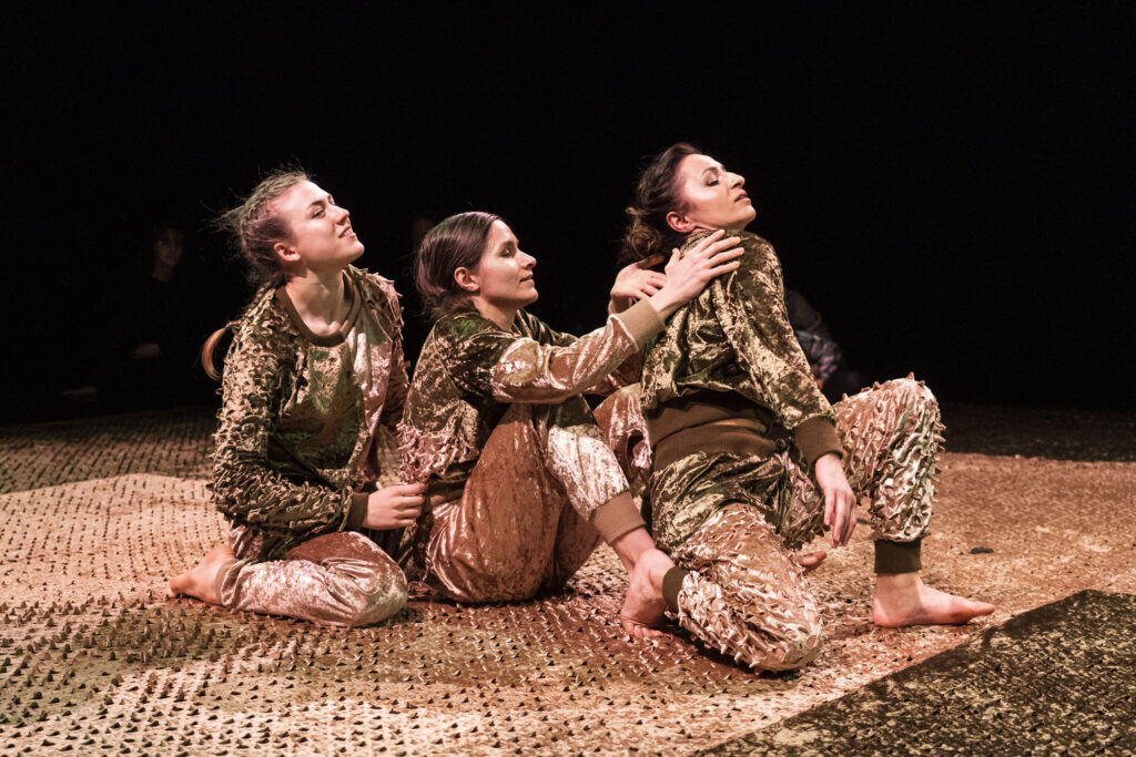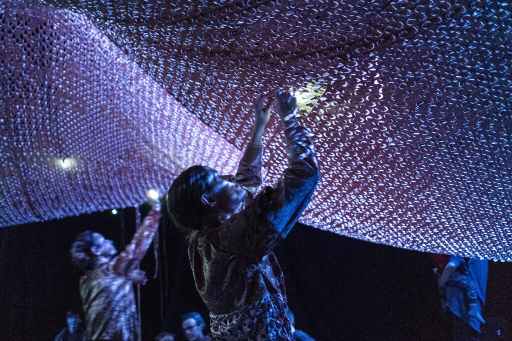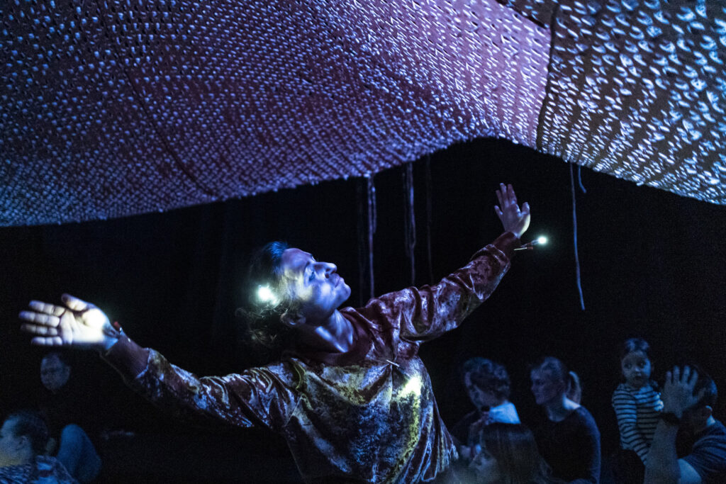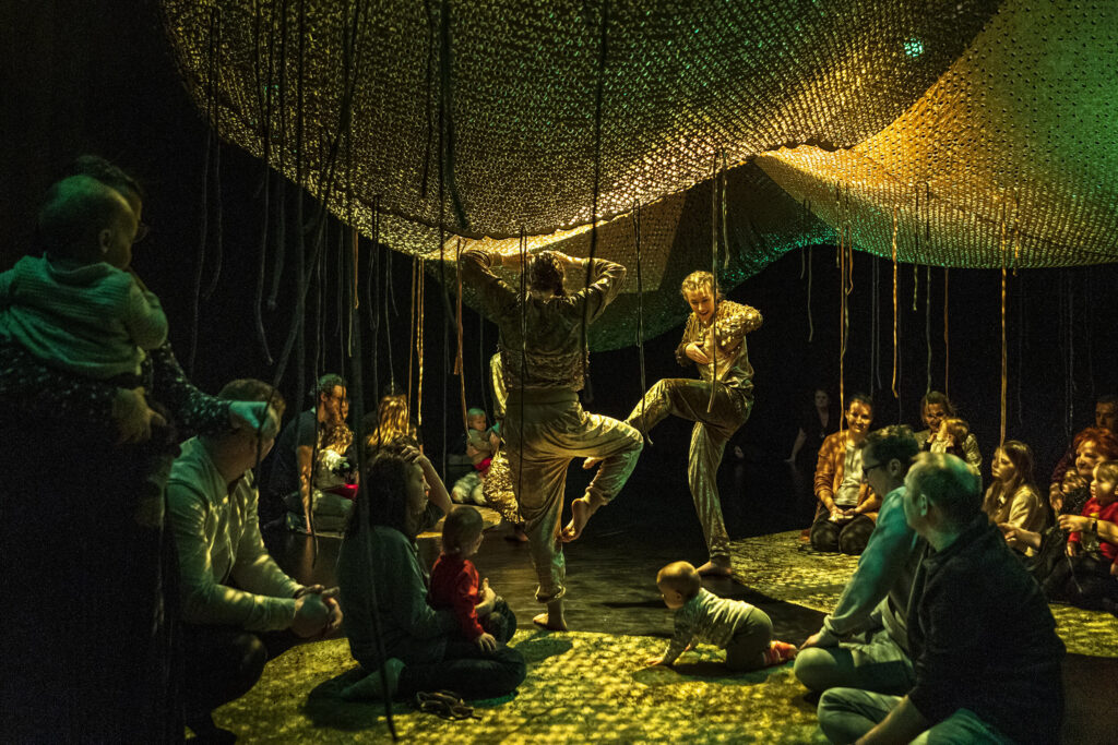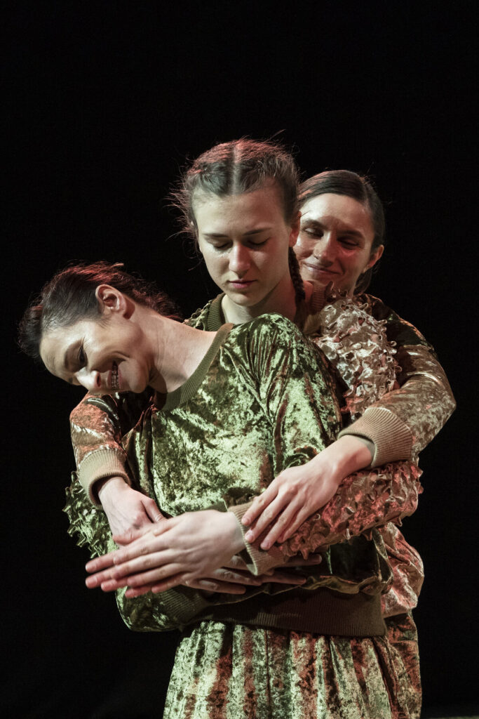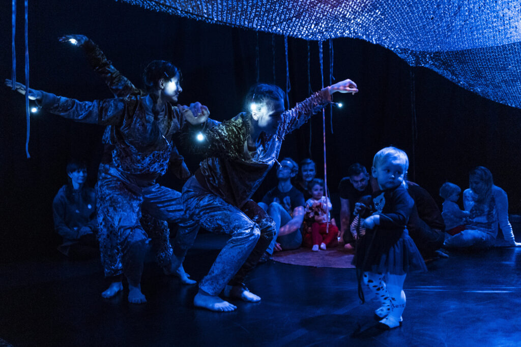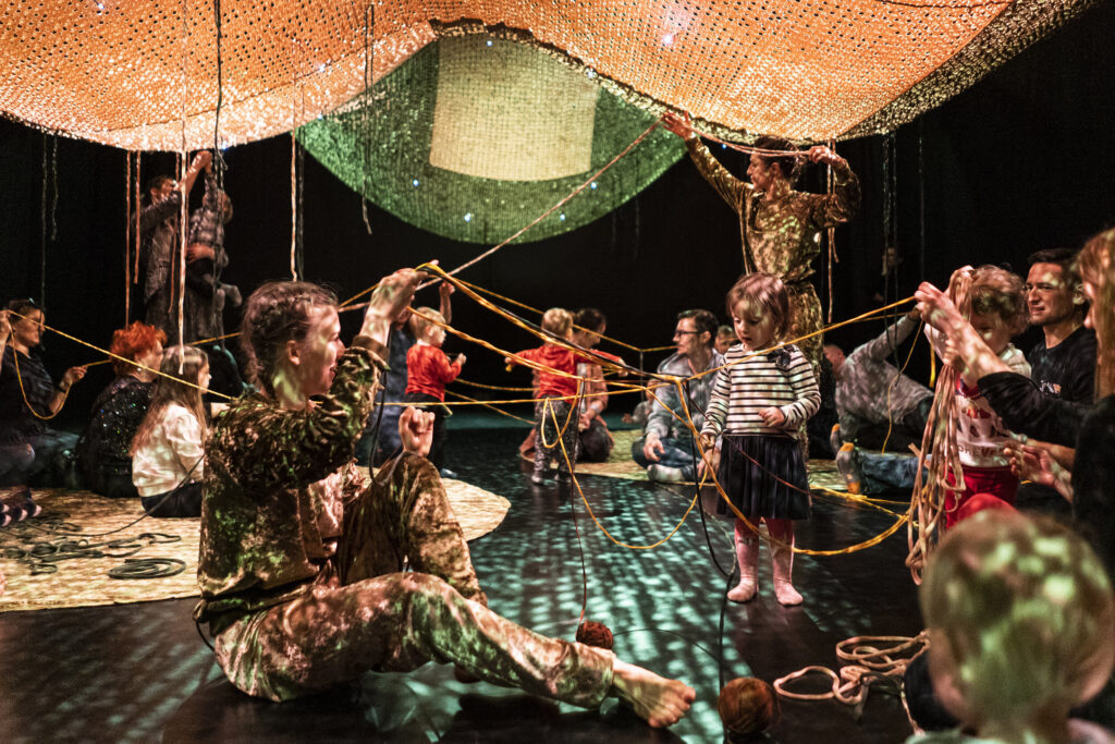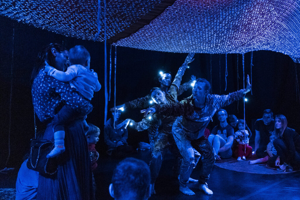 Dzięki reżyserii świateł przestrzeń wydaje się magiczna. Anna Janczarek, Aleksandra Salej, Monika Parafiniuk są ubrane w kostiumy uszyte z tego samego materiału, tańczą, w łagodny sposób przechodząc z pozycji do pozycji. Raz wydają się duchami lasu, innym razem ich ruch przypomina miękkie skoki łań. Po zmianie scenografii przyozdabiają się migoczącymi światełkami, niczym świetliki zwabiają oczy dzieci błyskotkami. W końcowej części zapraszają publiczność do zabawy z wykorzystaniem kłębków miękkiego sznurka – oplatają go wokół, przemieszczając się po przestrzeni. Rodziny same mogą animować zabawę w mniejszych grupach.
